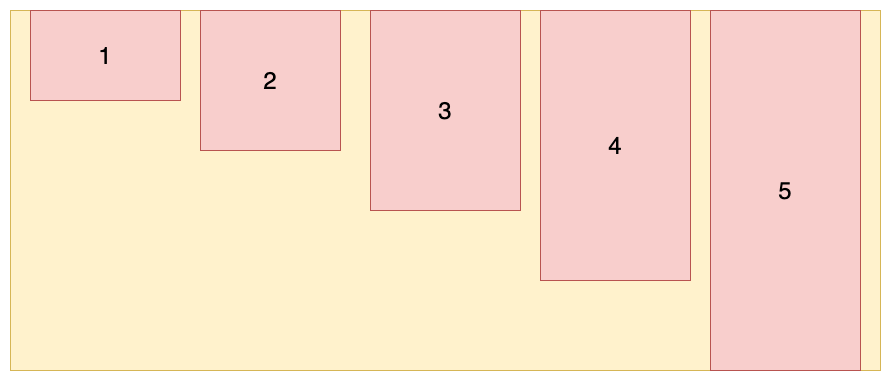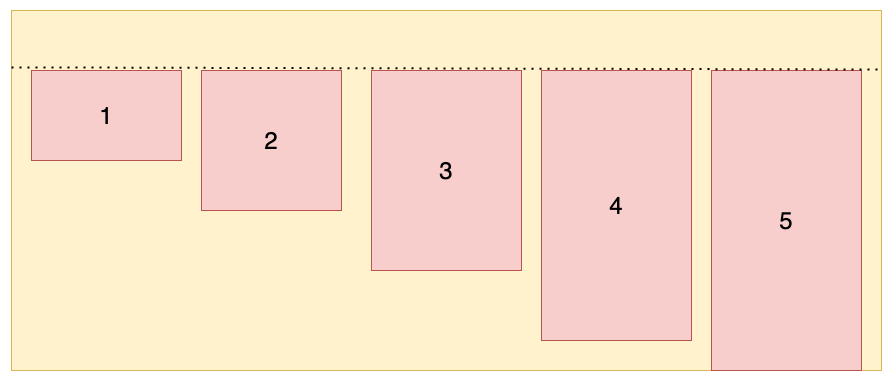 (1)align-items: flex-start:交叉轴的起点对齐(上面或左边)。设置容器高度为 100px,项目高度分别为 20px、40px、60px、80px、100px,效果如图所示: