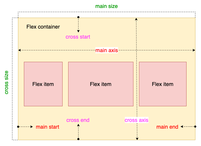 - cross-start & cross-end: 分别表示交叉轴的开始和结束。子元素在交叉轴的排布从cross-start开始到cross-end。